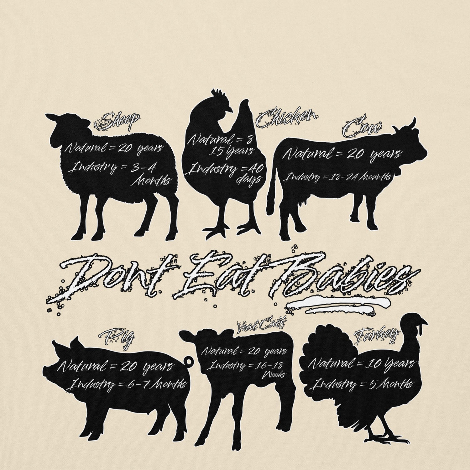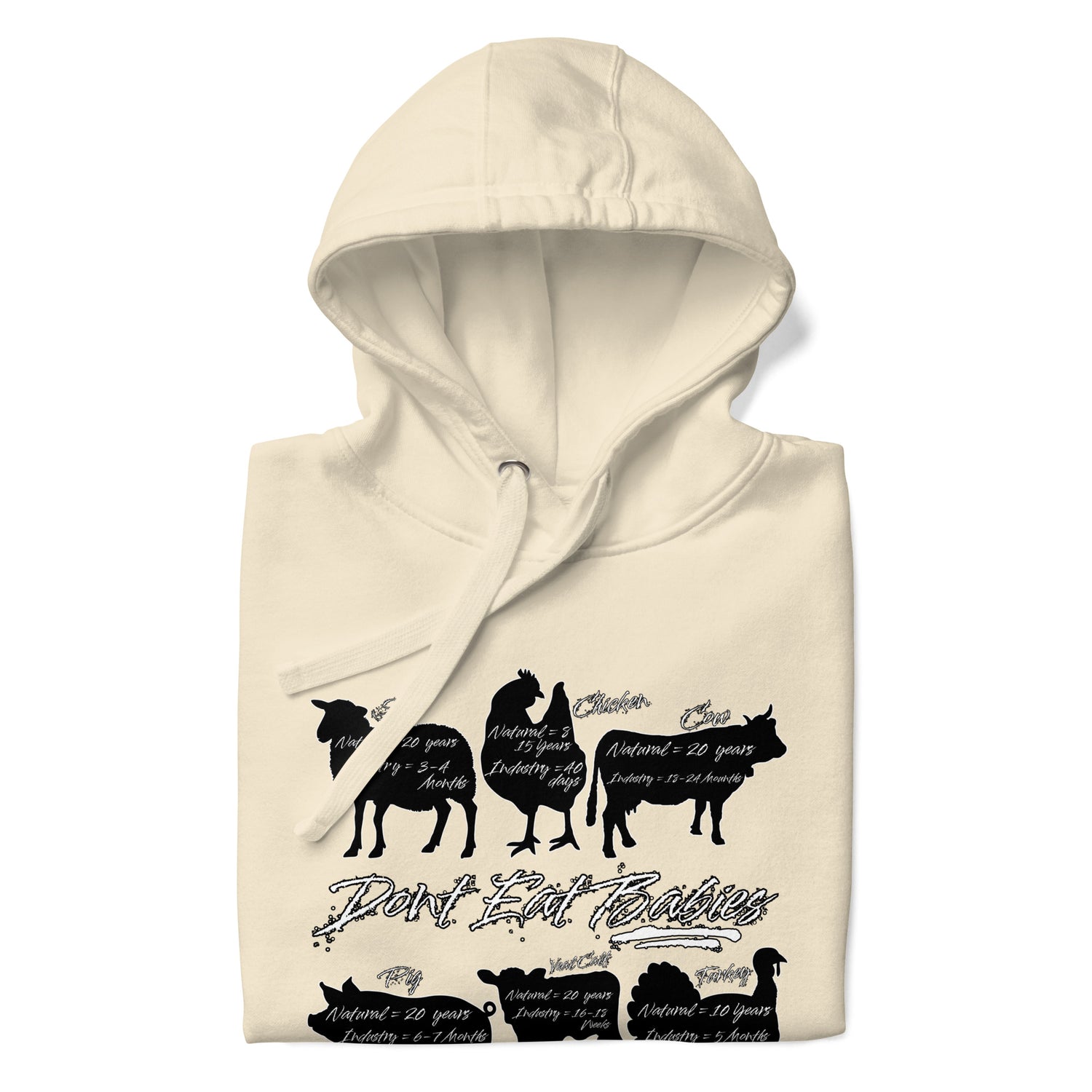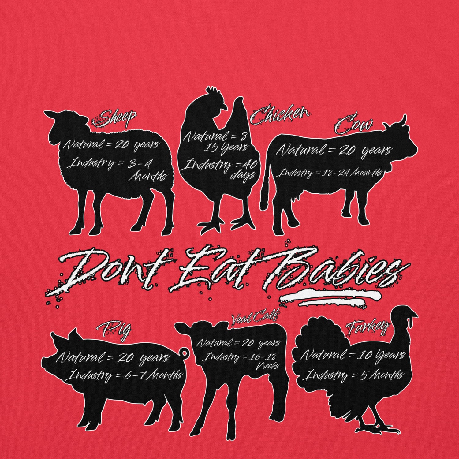 Take a stand for ethical eating with our Vegan "Don't Eat Babies" Hoodie. Show your support for animal rights and spread awareness with this premium unisex hoodie. Available in multiple bold colors and constructed with high-quality materials, It features a a infographic with the natural and industry lifespans of the most consumed animals. it's the perfect way to speak out against the consumption of innocent lives. Join the movement now!