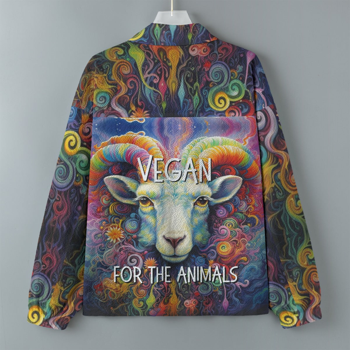 This is your go-to piece for vegan activism! This lightweight lapel jacket is sure to turn heads with its vibrant colors and unmistakable vegan style. Let your look do the talking and show your commitment to the cause with this hip vegan-friendly jacket. Spread the word, and make a statement!