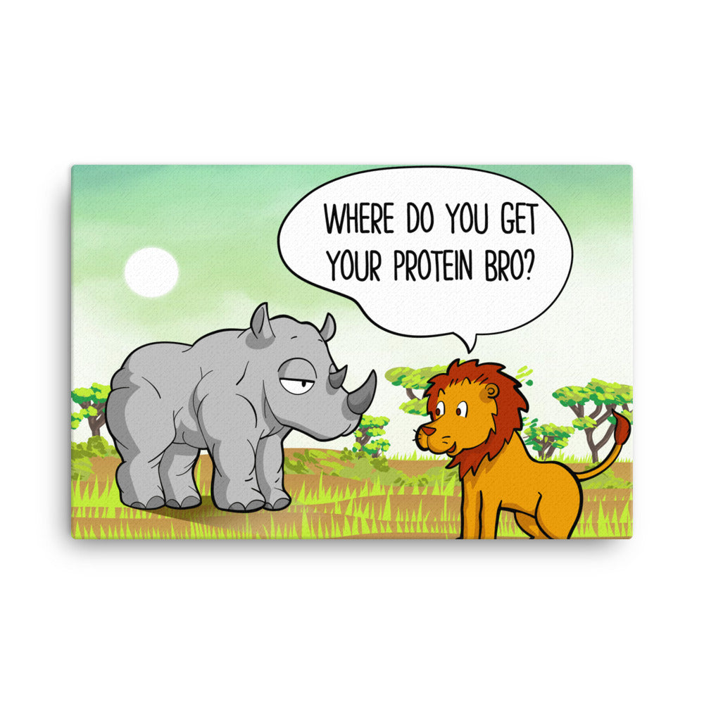 Being vegan undoubtably you have heard "Where do you get your protein?" Yes its a silly question but what can you say if you don't know any better... This mouse pad features the sarcastic rhino being asked for the 100th time by the lion " where do you get your protein bro?".........