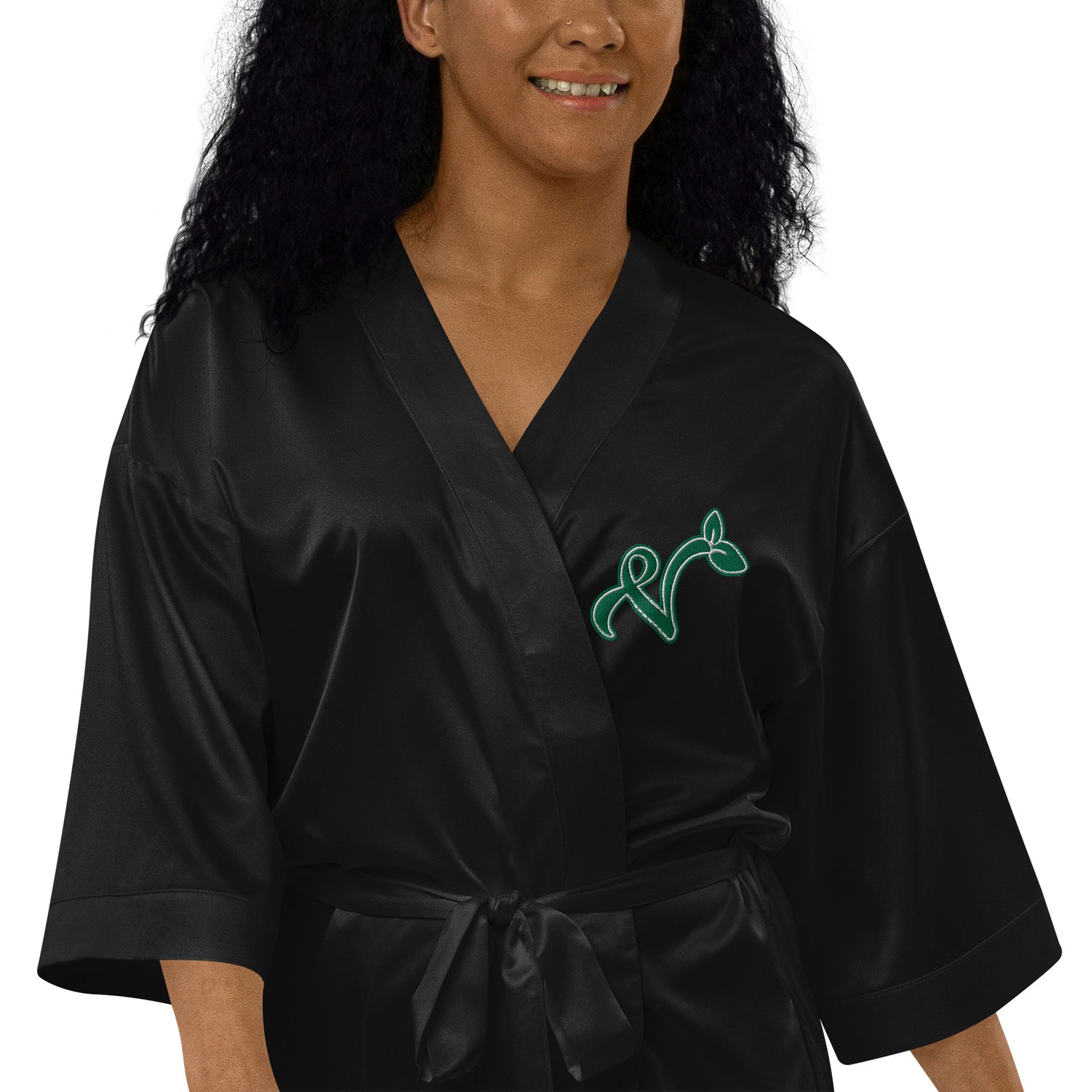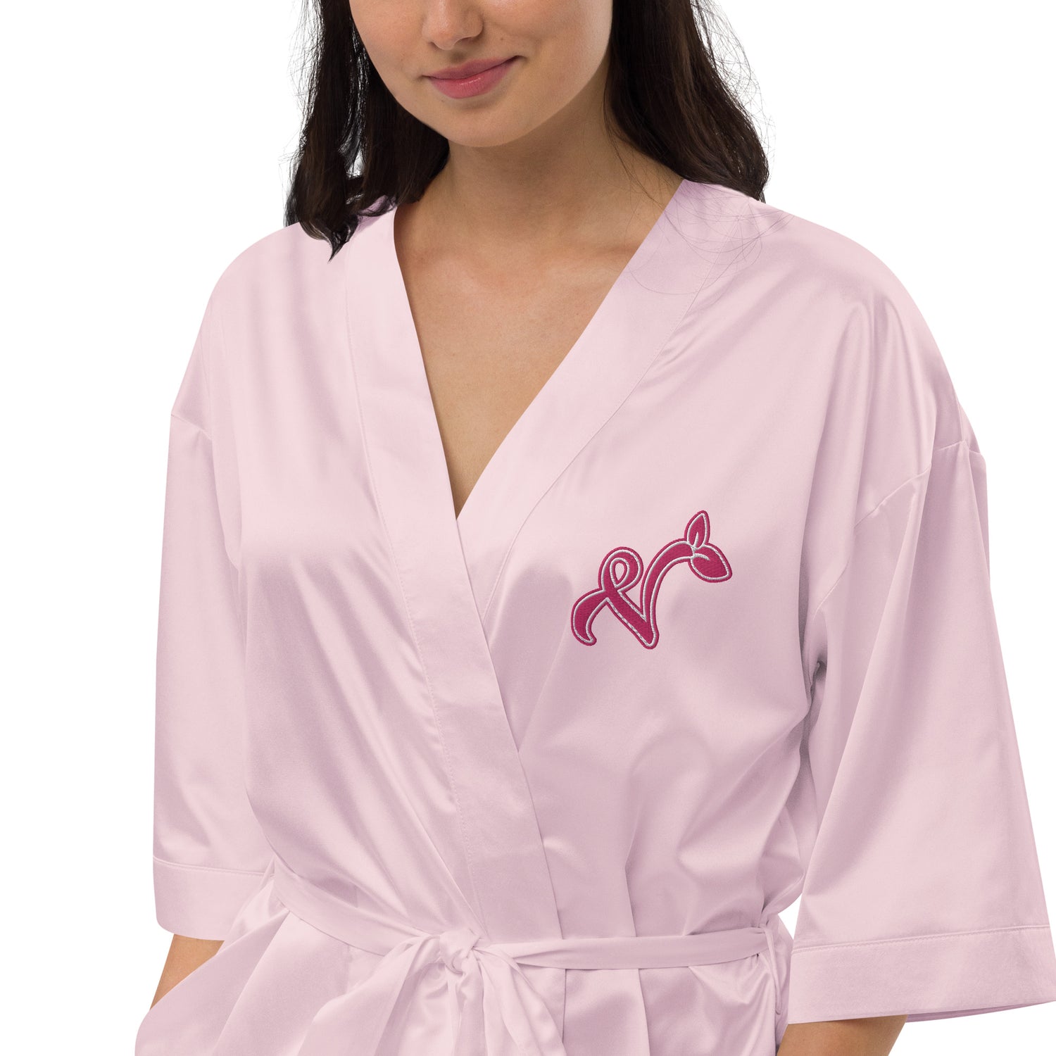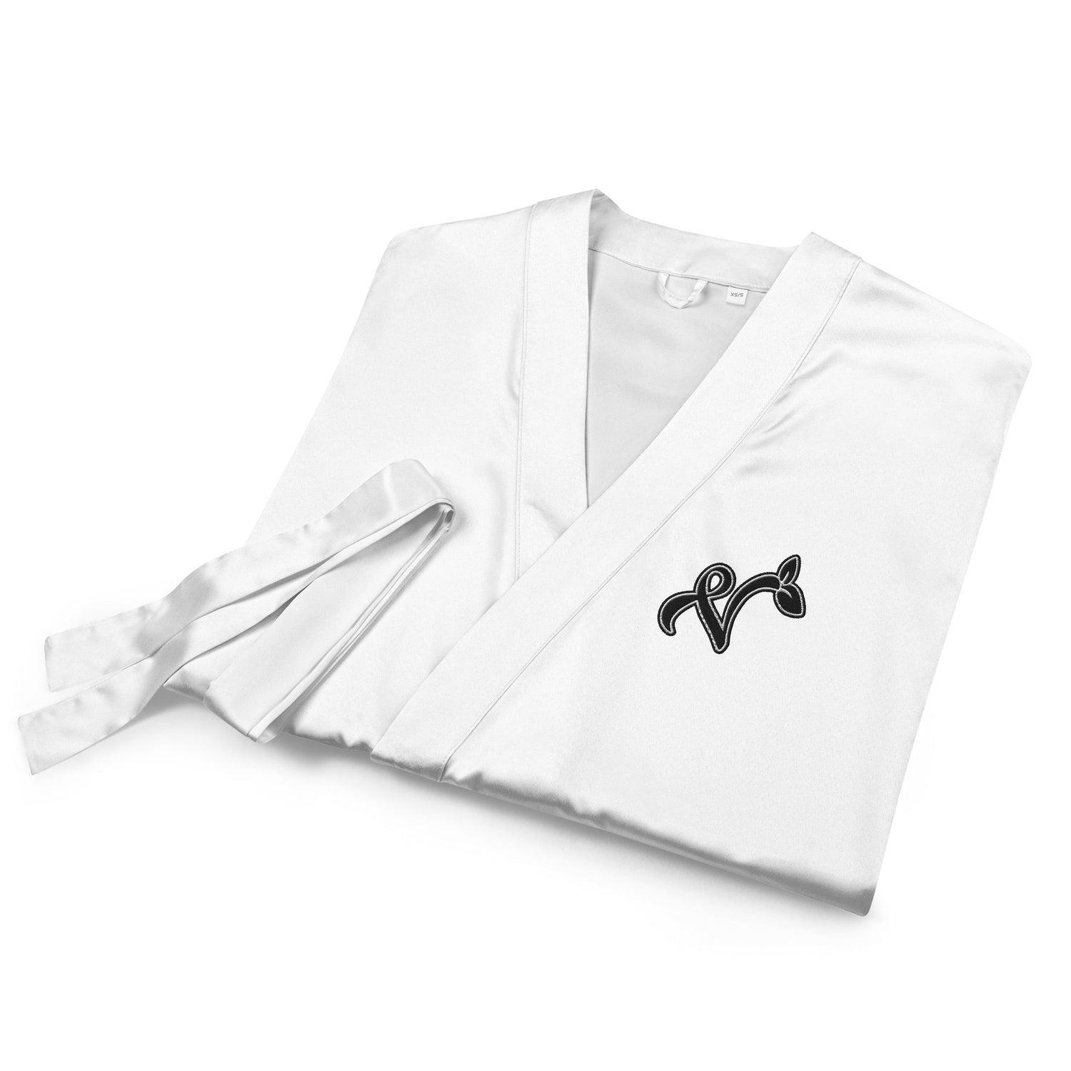 Relax with your moral compass on display in this elegant embroidered satin robe
