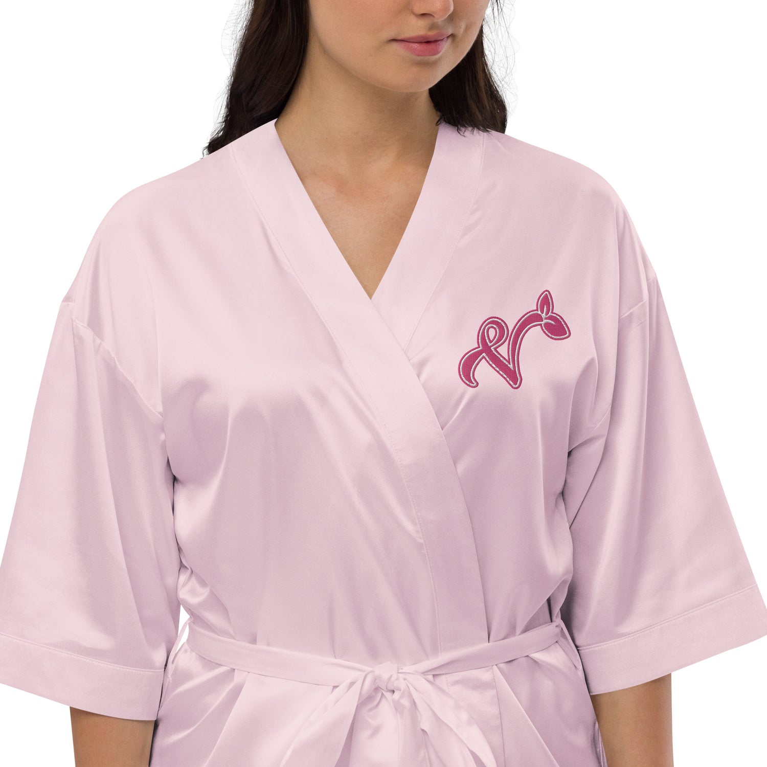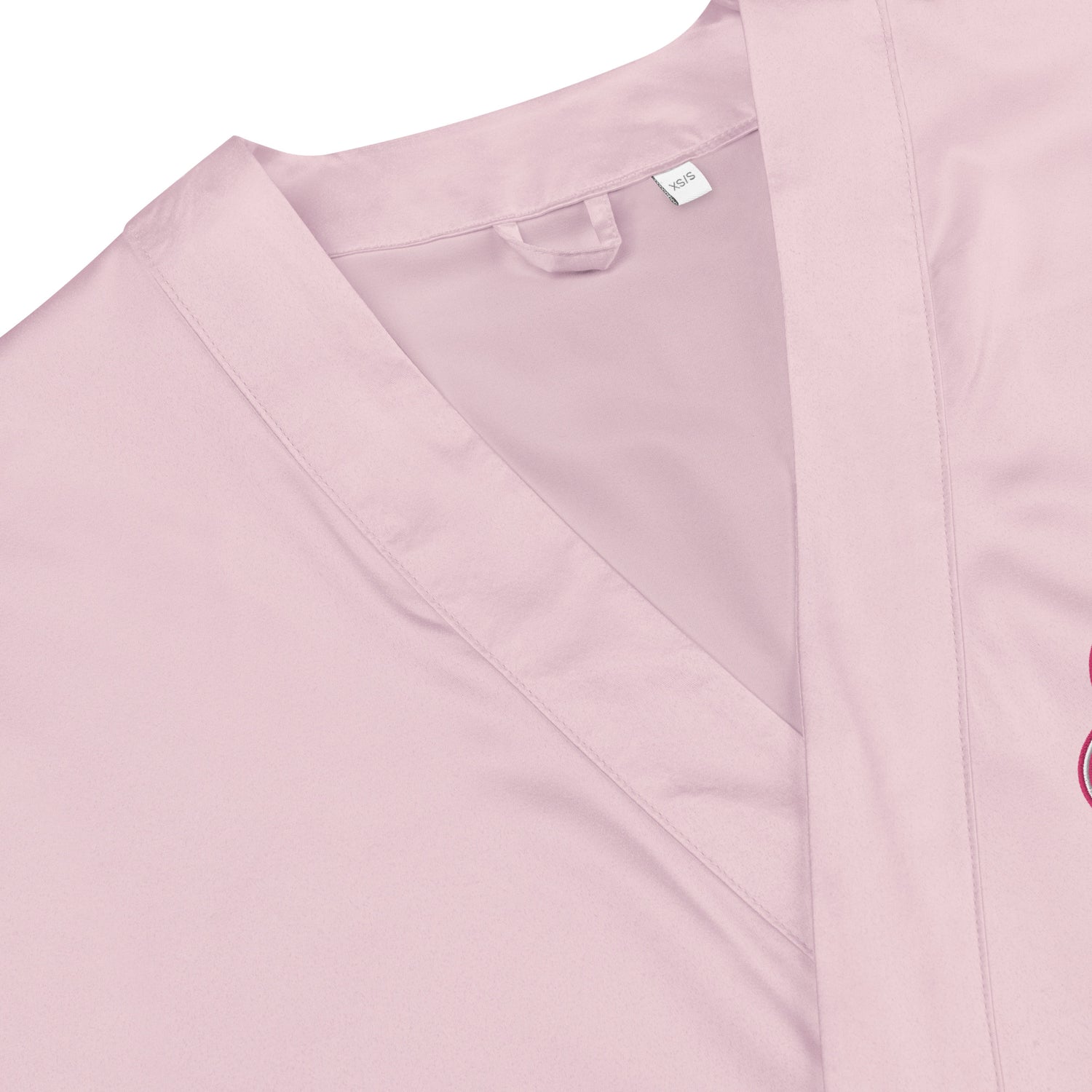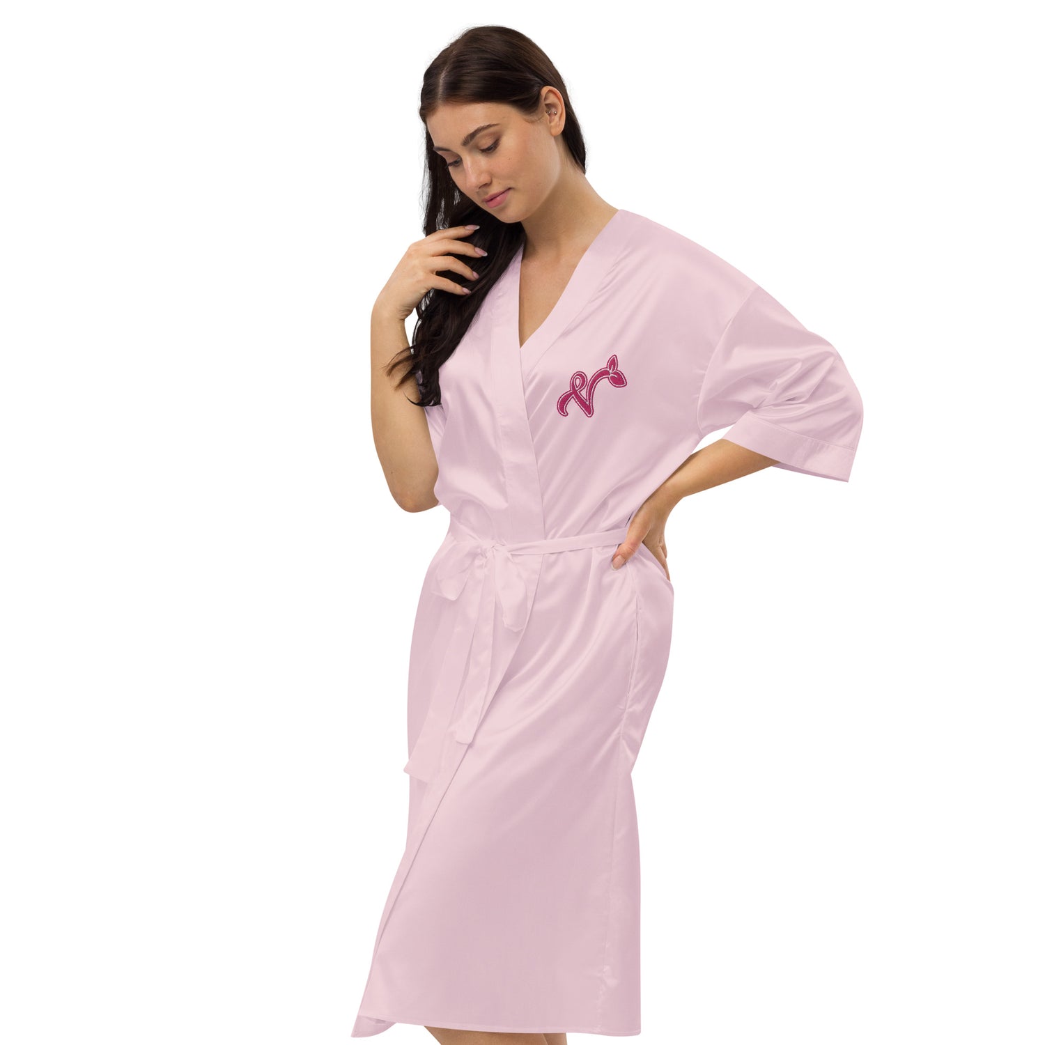 Relax with your moral compass on display in this elegant embroidered satin robe