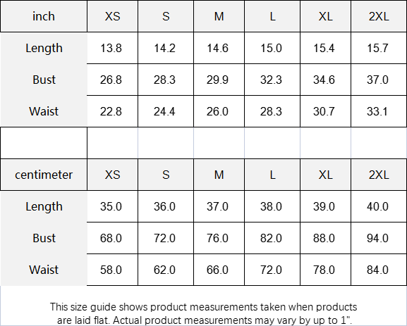 This size guide shows product measurements taken when products are laid flat. Actual product measurements may vary by up to 1".