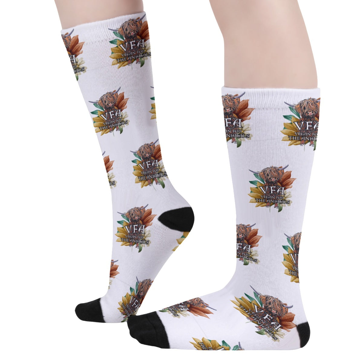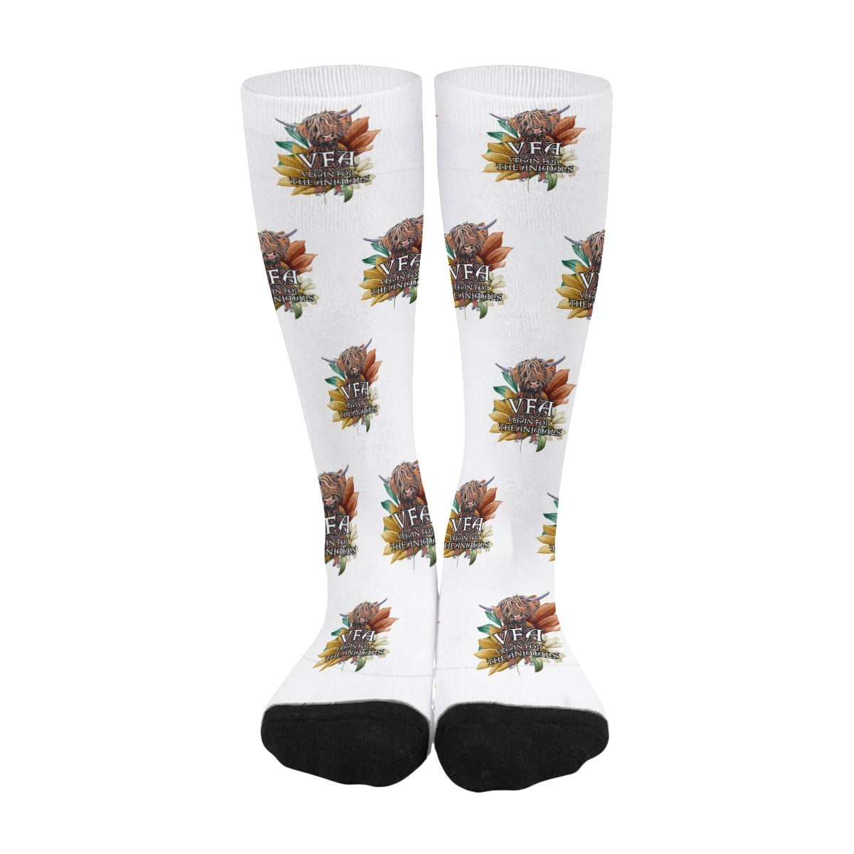 Take a stand against animal cruelty with our VFA Long Socks. Crafted from poly cotton blend, these bold socks help you express your values and what veganism is about in every step!